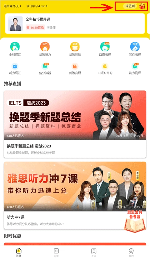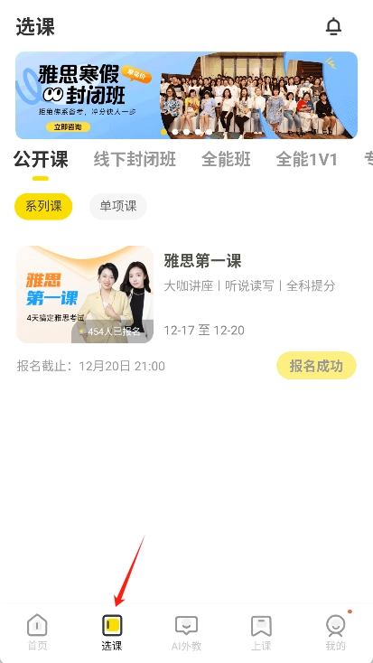 1、打开土豆雅思应用,进入选课界面后找到已报名的课程,点击该课程即可。