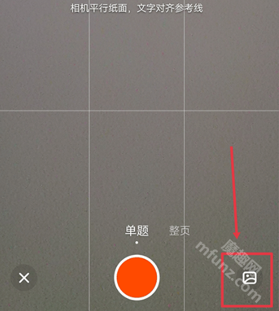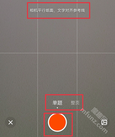 2. 在拍照区域的上方,选择“拍单题”或者“整页”模式。要保证相机与待拍摄的内容平行且正面相对,让文字和参考线对齐,之后点击红色的拍照按钮。