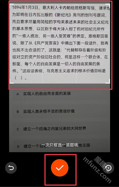 3.以拍单题为例,拍照结束后,用方框框选出题目内容,接着点击红色勾按钮来启动搜索。