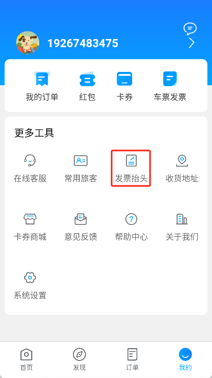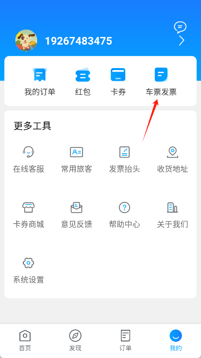 4、返回至我的界面,点击【车票发票】功能。