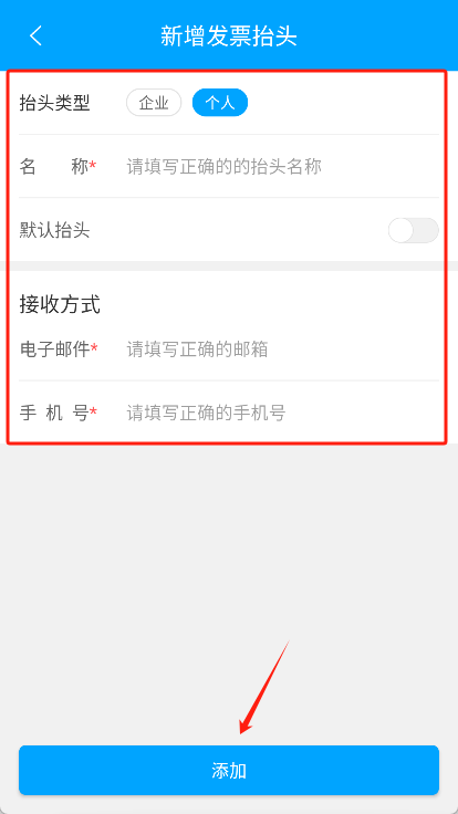3、若需要新增发票抬头,可点击【添加抬头】按钮,填写完整相关信息后保存设置即可。