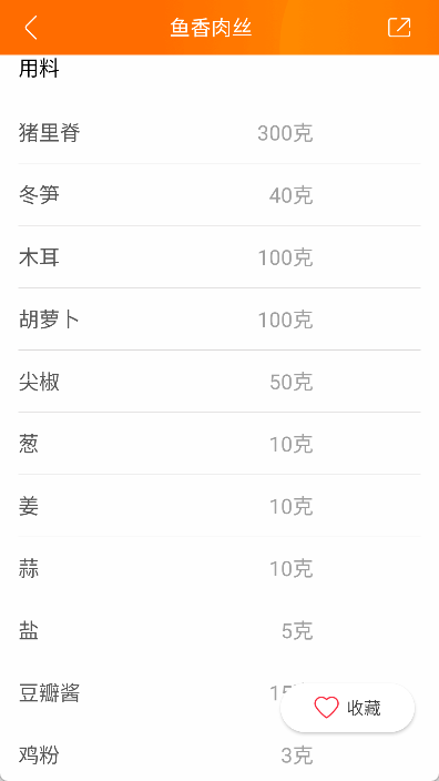点击进入鱼香肉丝的详情页后,就能看到制作这道菜需要准备的食材清单以及对应的用量。