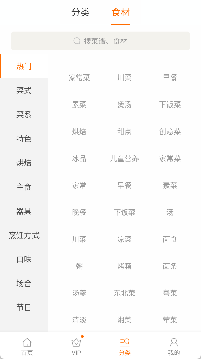 详细的菜谱分类,包括食材、菜式、菜系、特色、口味、烹饪方式、场景、节日等。