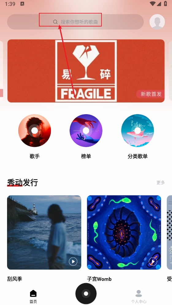 1、打开软件,在首页选择或直接搜索歌曲。