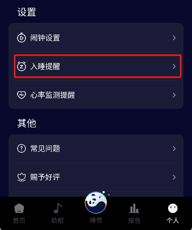 2、用户可在个人主页设置入睡提醒时间,这样就能在指定时间收到提醒,提前为入睡做准备。