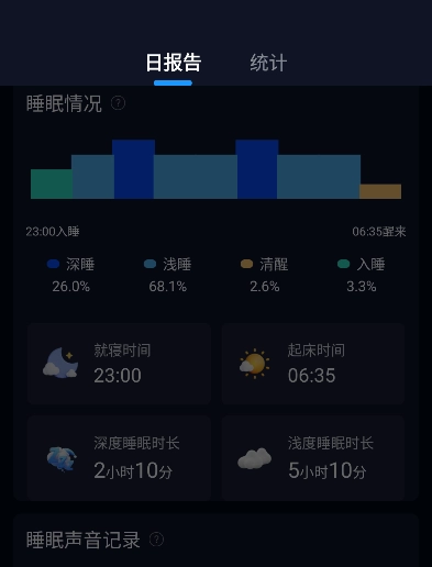 4、睡眠结束后会生成包含睡眠周期、梦话鼾声记录等内容的详细睡眠报告,助力用户掌握自身睡眠状况。
