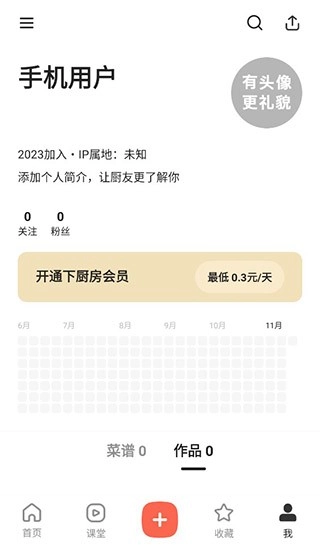 用户点击下方“我的”按钮就能进入个人中心,在那里可以查看自己的菜谱、作品,还有账号信息。