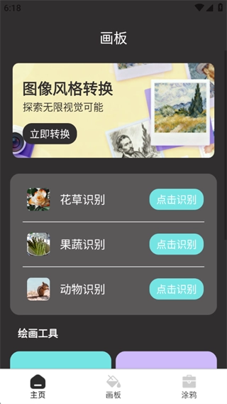 画趣绘艺坊是一款融合创意绘画与便捷识别功能的创作工具,不仅支持自由涂鸦、临摹填色和图像风格转换,助力用户挥洒艺术灵感;还配备实用的动植物识别功能,能快速辨认日常物品,让创作过程与生活探索都充满更多乐趣。