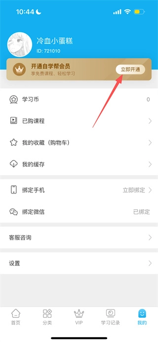 2、进入个人中心页面后,点击“立即开通”按钮,即可跳转至VIP开通页面。