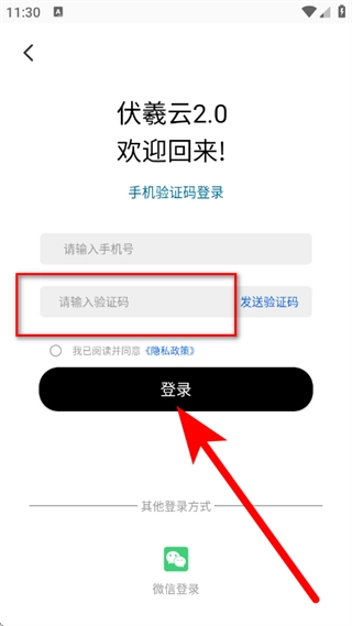 3、进入伏羲云登录界面后,填写手机号,接着点击发送验证码的按钮。