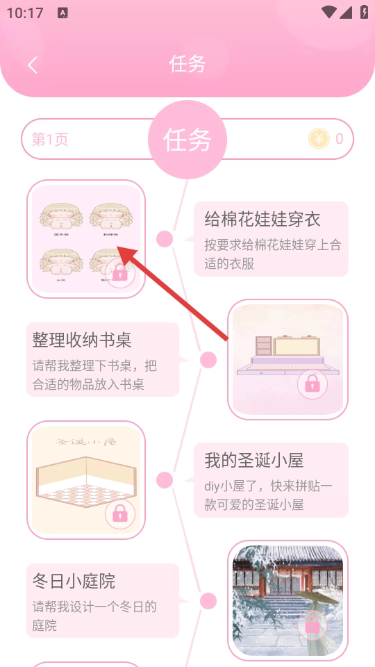2、进入任务页面后,找到并选择【给棉花娃娃穿衣】这一任务,随后即可进入棉花娃娃的穿衣编辑页面。