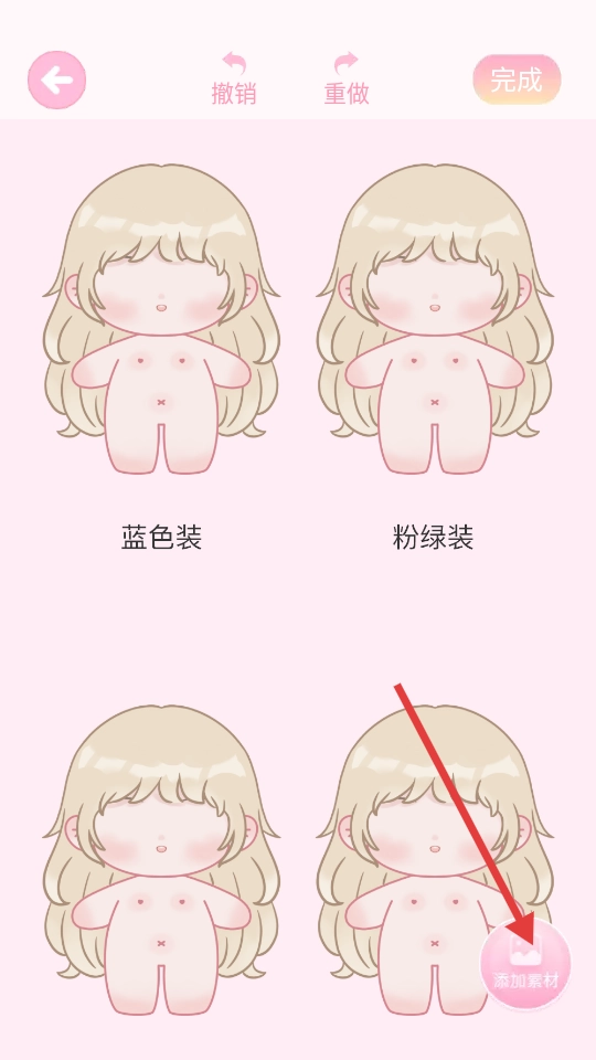 3、进入棉花娃娃的穿衣编辑页面后,点击【添加素材】按钮,就能挑选各种类型的服装素材。