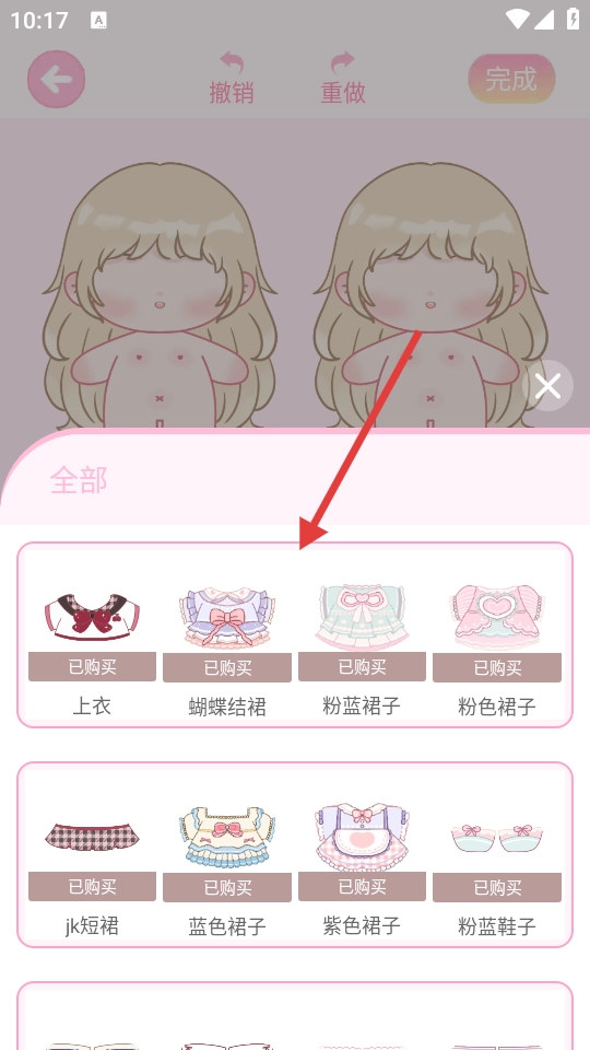 4、进入素材选择界面后,挑选心仪的服装素材,给棉花娃娃搭配上合适的服饰,全部完成后点击【完成】按钮即可结束当前任务。