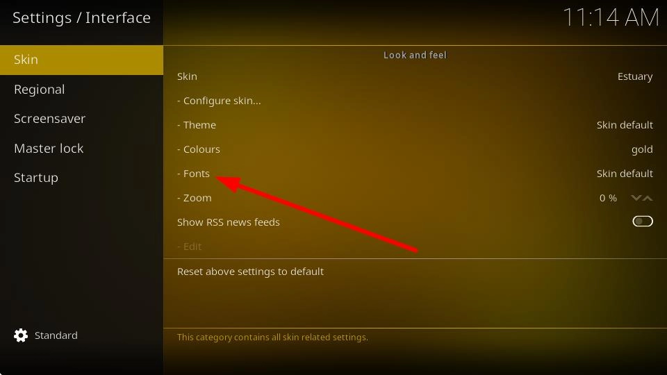 3、进入【Settings/Interface】页面,在【Skin】设置板块里找到【Fonts】选项,点击该选项即可打开字体选择界面。