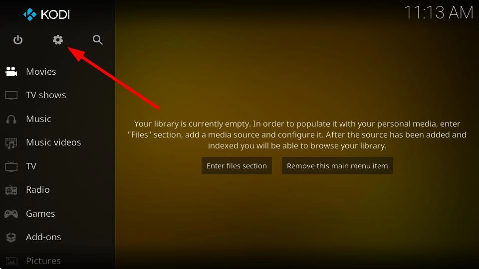 在KODI主界面中,点击左侧的设置图标即可进入设置界面。