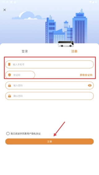 4、进入注册页面后,先填写手机号,接着点击“获取验证码”选项,输入收到的验证码,随后设置并确认登录密码,最后点击注册按钮,即可完成账号的注册流程。