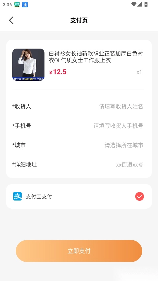 4. 最后填写收货人姓名、手机号码以及详细地址信息,点击“立即支付”按钮,就能完成支付并下单购买商品。