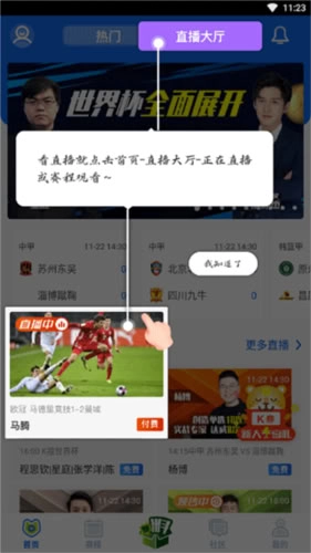 1、看直播:点击首页-直播大厅-正在直播或赛程观看。