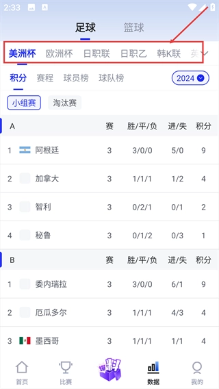 1、点击底部导航栏中的【数据】选项,即可进入赛事数据统计页面。
