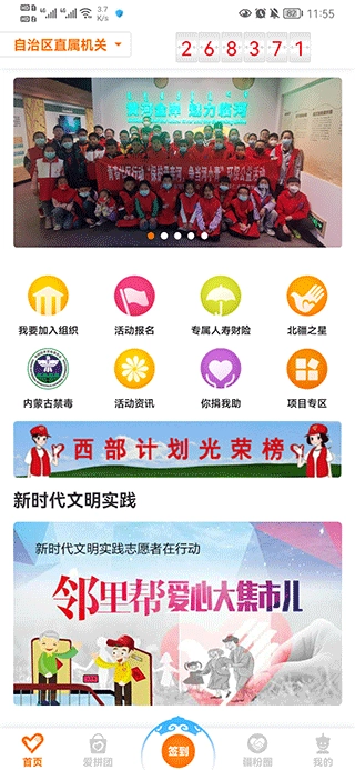 1、注册登录志愿北疆后,用户可以在首页中加入组织、参加活动报名、你捐我助等活动