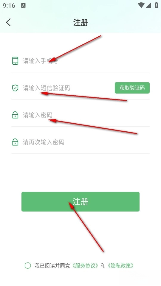 选择填写自己的手机号、验证码以及密码后点击注册即可注册成功。