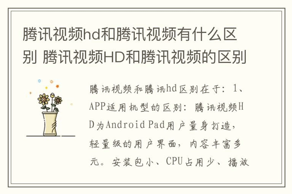 1、适用机型的区别:腾讯视频HD为Android Pad用户量身打造,轻量级的用户界面,内容丰富多元。安装包小、CPU占用少、播放更加流畅清晰。大片、剧集、综艺,动漫,最新最热的视频资源,高清观看。支持播放记录的功能,方便进行视频续播和回放。