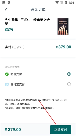 4、确认专辑信息与实际支付金额无误后,点击【立即支付】按钮,即可完成课程的购买流程。