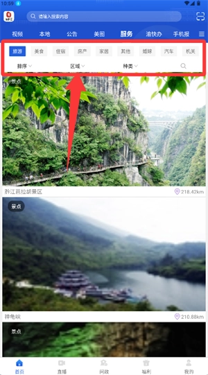 2、在主页的服务栏目里找到旅游分类并点击进入,接着通过筛选功能来查找你想要的目标内容。