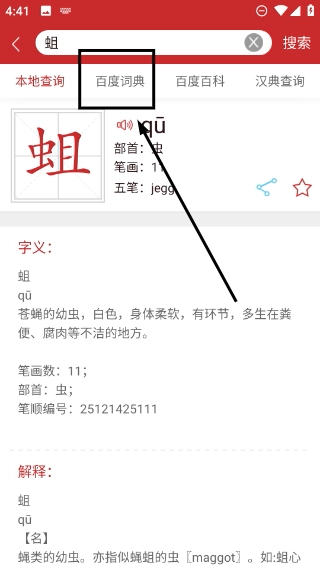 3、进入查询结果页面后,切换到【百度词典】标签,就能查看该字的详细解释说明,像蛆的定义、笔画等内容都能看到。