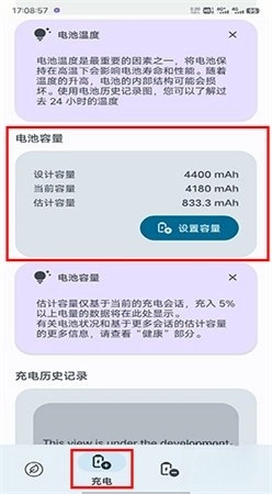 2、点击底部菜单栏里的“充电”按钮进入对应页面,向下滑动找到电池容量这一项,就能看到电池的出厂容量和预估容量(也就是电池寿命)。