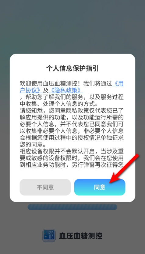 1、进入血压血糖测控功能后,首先需要点击同意按钮方可使用该功能。
