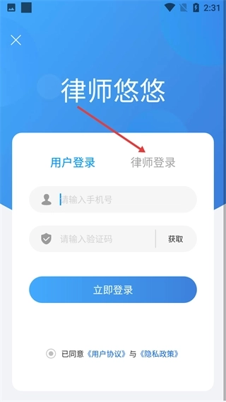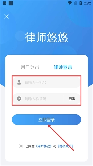 3、进入【律师悠悠】的登录页面后,系统会默认选中【用户登录】标签页,接着需要依次填写手机号、获取并输入验证码,在勾选相关协议后点击【立即登录】按钮即可。