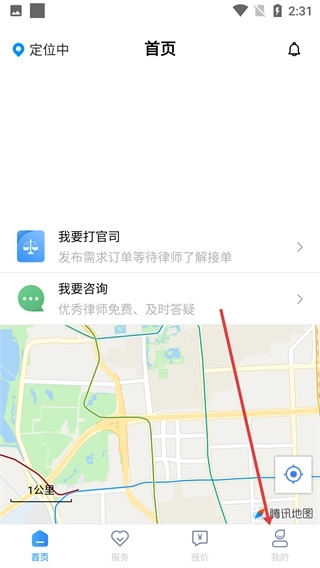 在【首页】界面,你可以选择【我要打官司】来发布需求订单,也可以选择【我要咨询】以获取律师的免费答疑服务,点击底部的【我的】就能进入个人中心。