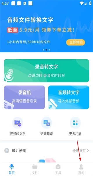 打开软件后,先进入录音页面查看默认模式的介绍,再点击“我的”选项进入个人中心页面。