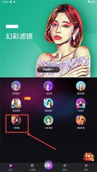 2、在主界面的特效功能区域中,点击“一键换装”选项,即可进入对应的换装素材选择界面。