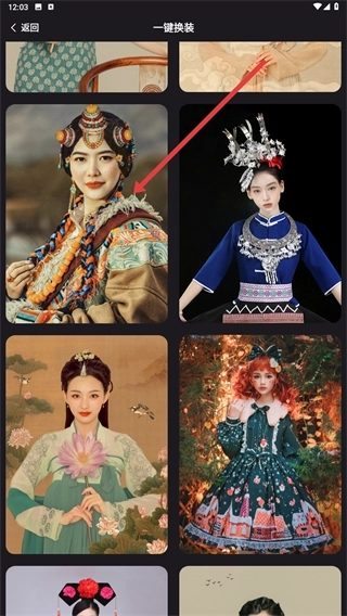 3、在一键换装页面,挑选目标装扮素材(例如民族风服饰),点击该素材后,即可进入其解锁或使用的流程。