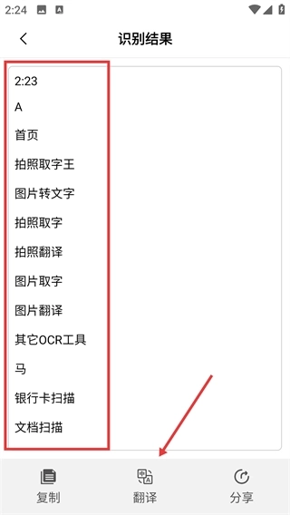 完成文字识别后,在识别结果页面可以查看提取出的内容,也能点击底部的【翻译】按钮来进行文字翻译的操作。