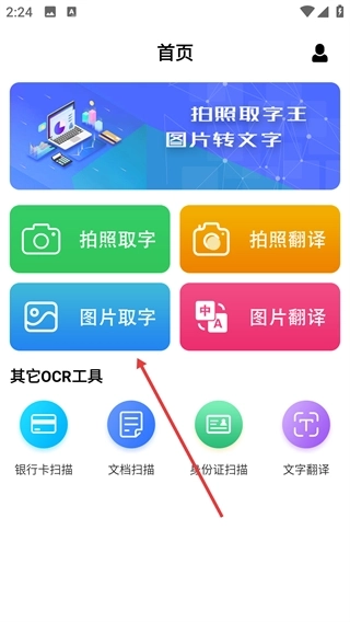 1、在首页点击【图片取字】功能,既可以上传图片提取文字,也能使用【拍照取字】【拍照翻译】等OCR相关工具。