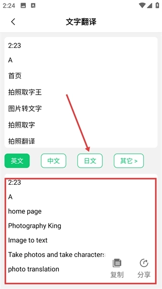 进入文字翻译页面后,你可以选择目标语言(例如【日文】),此时系统会自动把提取到的文字转换成该目标语言的内容。