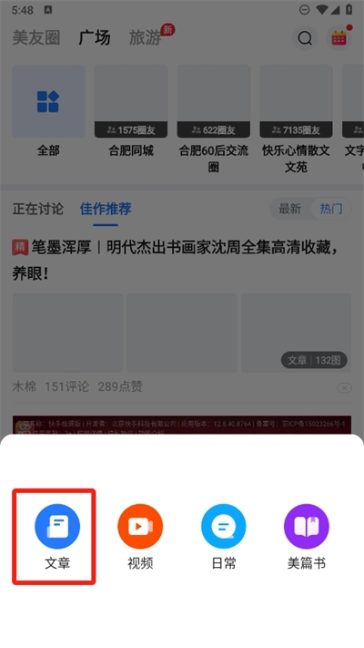 进入软件后,能看到广场区域有不少用户发布的文章内容,要是我们想发布内容,可以在“+”这个按钮处找到入口。