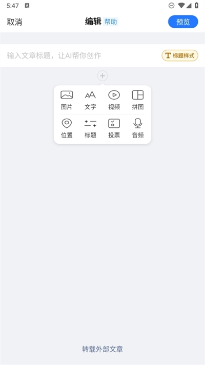 打开软件后,点击首页顶部的“+”号按钮,接着选择文章选项,就可以开始进行编辑操作了。
