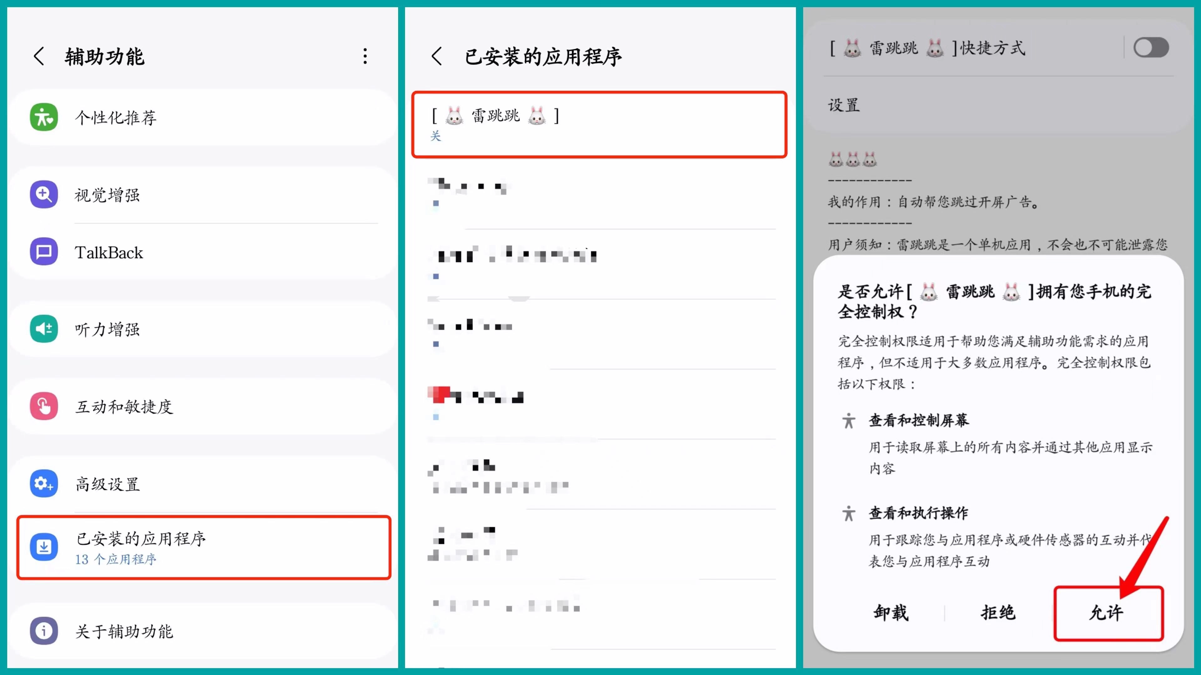 进入主页面后,点击“立即前往>>”按钮可快速进入开启流程。完成这一步后,依次通过“已安装”选项找到“[雷跳跳]”,并为其开启无障碍权限(部分手机系统可能会弹出提示,直接确认授权即可)。