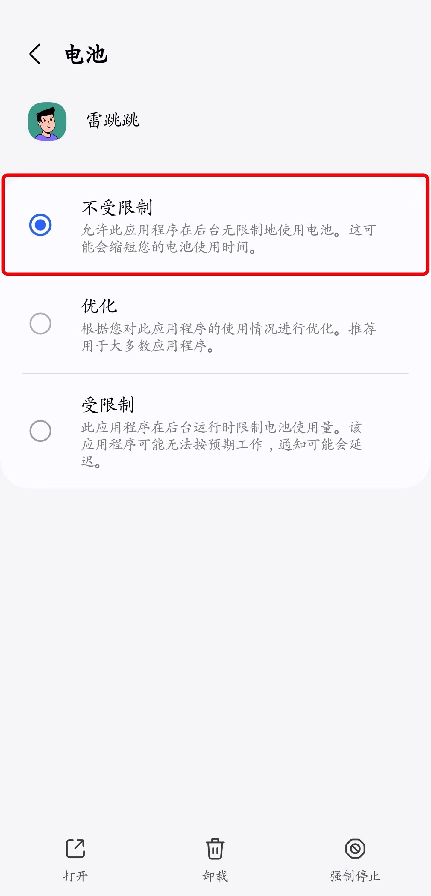 安卓系统具备应用电源优化机制,经该机制处理的应用无法在后台持续运行。若要确保雷跳跳运行稳定,需将其电源优化等级调整为不受限制或不进行优化。