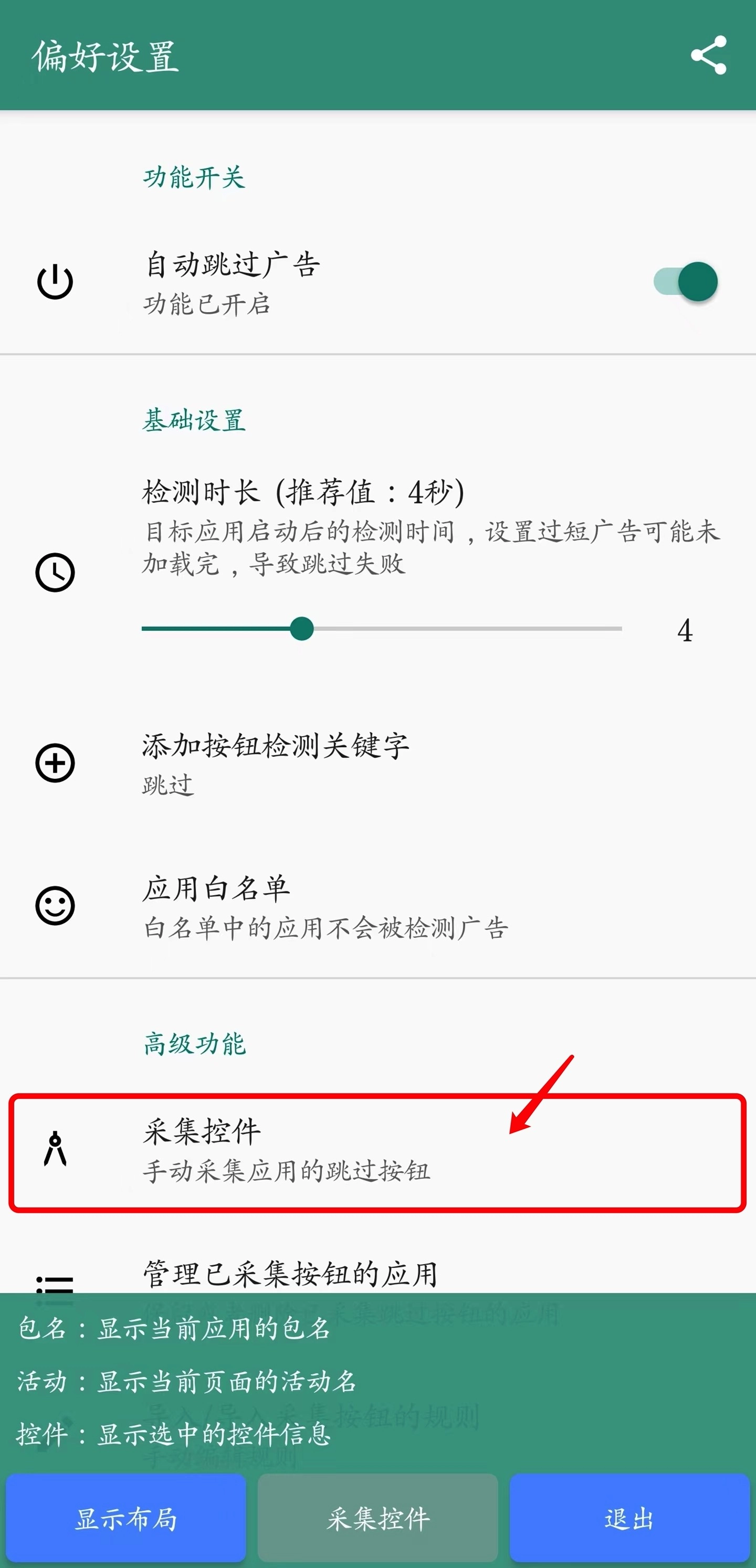 打开应用后若出现广告,可先点击左下角的显示布局按钮,此时界面布局会被绘制出来,每个控件都会被绿色线条包裹。