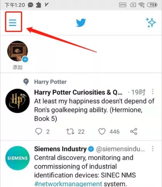 在手机上启动推特应用后,找到界面左上角的三条横线图标并点击,即可进入到个人中心页面。