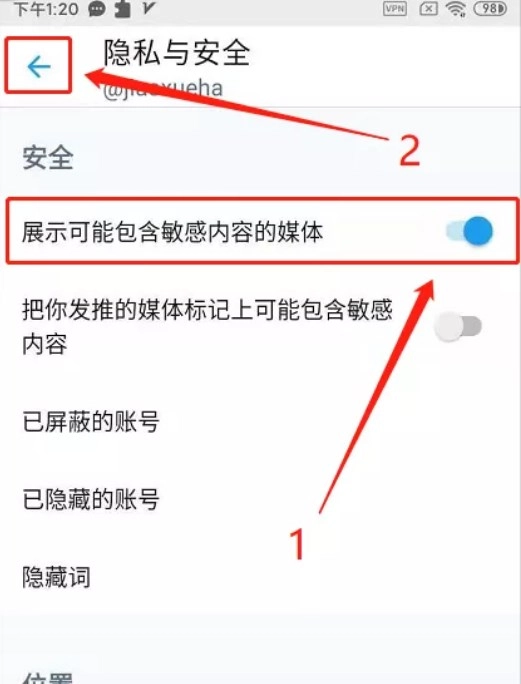 点击开启「展示可能包含敏感内容的媒体」选项,随后点击「返回」按钮以保存相关设置。