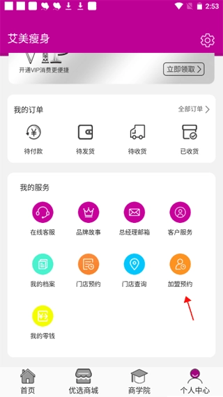 打开软件后,在底部导航栏找到“个人中心”入口进入,接着在页面内的“我的服务”板块中点击“加盟预约”选项。