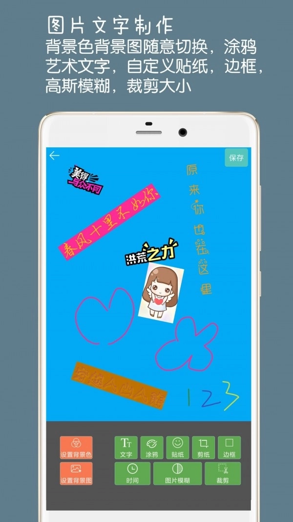 3、还能够选择涂鸦、文本等选项,使用自定义贴纸、高斯模糊等功能。