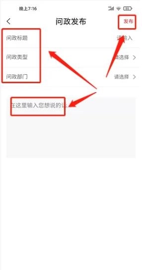 4.进入问政发布页面,填写问政标题,选择对应的问政类型与问政部门,输入具体的问政内容后,点击【发布】按钮即可。
