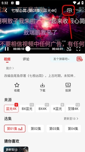 2.打开视频播放界面,点击右上角的“tv”标识。